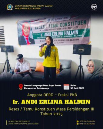 Matarakyatta, Bulukumba.- Memasuki masa sidang III tahun 2025, Anggota Dewan Perwakilan Rakyat Daerah (DPRD) Kabupaten Bulukumba, Daerah Pemilihan (Dapil) Bulukumpa – Rilau Ale, Ir.Andi Erlina Halmin mengggelar reses atau temu konstituen di Dusun Lempongnge, Desa Sapobonto, Kecamatan Bulukumpa, Kabupaten Bulukumba, Rabu 30 Juli 2025.