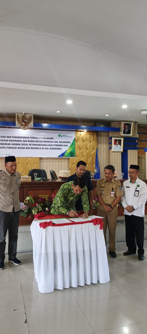 Ketua Dewan Masjid Indonesia (DMI) Kabupaten Bulukumba H.Andi Muttamar Matottorang bersama kepala BPJS ketenagakerjaan Abrianto, S.H., M.H. resmi menandatangani perjanjian kerja sama perlindungan jaminan sosial ketenagakerjaan bagi pengurus DMI, pengurus Masjid,serta penggiat Masjid dan Musholla di Kab.Bulukumba.